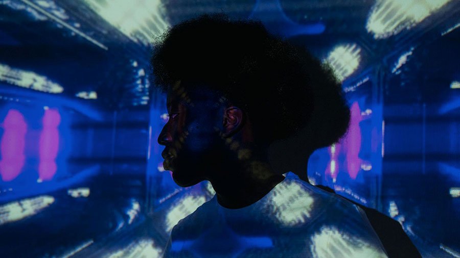 Color: Deep indigo and electric neons simulate the visual intensity of high-quality sound.